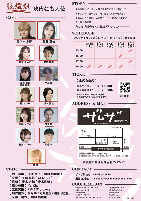 | スタッフ | 【 作・演出 】永吉 悠人( 劇団 狼煙組 ) 【 音響 】平田 忠範( GENG27 ) 【 照明 】青木 大輔( 青木照明 ) 【 舞台美術 】Yu-Chan 【 宣伝美術 】(株)アリセーオ 【 制作協力 】烏丸 柊 / 石井 佳澄( 劇団 狼煙組 ) 【 企画・製作 】劇団 狼煙組 |